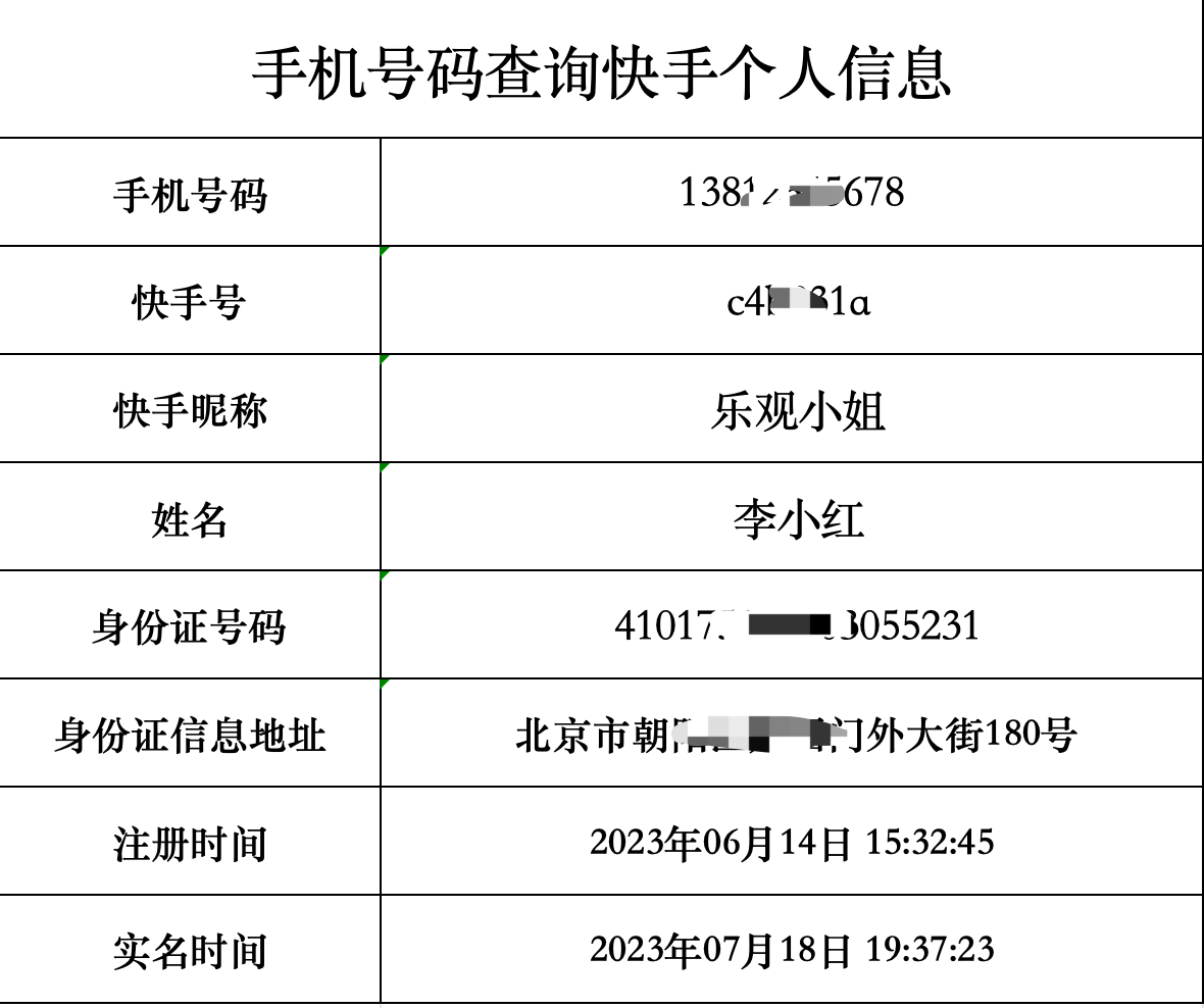 需提供快手号,可查出此号的身份证信息,包括姓名,身份证号,身份证地址。或提供身份证号查实名注册的快手号